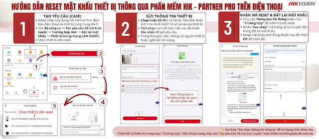Reset qua Hik-Partner Pro: tạo case hỗ trợ → gửi thông tin thiết bị → nhận phản hồi trực tiếp trên app.