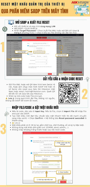Reset qua SADP (PC): xuất file XML / mã QR → gửi yêu cầu → nhận mã/file xác thực để đặt lại mật khẩu.