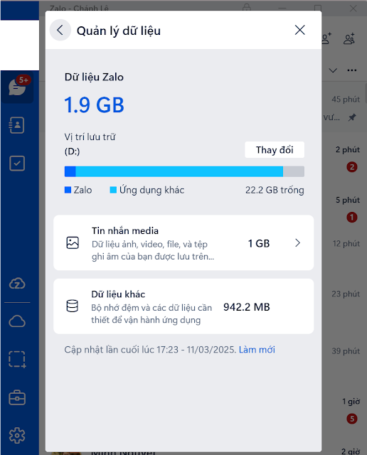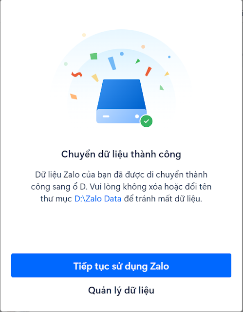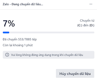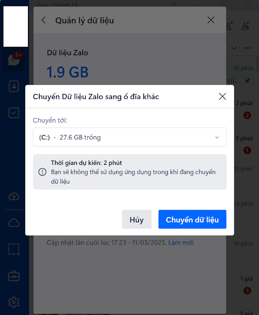 Thủ thuậtCách chuyển dữ liệu Zalo trên máy tính từ ổ C sang ổ đĩa khác Đăng vào 25/05/202502/10/2025 bởi Chanh Mở ứng dụng Zalo trên máy tính -> Chọn icon cài đặt -> Vào Cài đặt -> Vào Quản lý dữ liệu (Như hình) Chọn ổ đĩa đích để di chuyển Quá trình di chuyển đang diễn ra, hãy chờ đợi Thư mục Zalo sau khi chuyển từ ổ C sang ổ D Thẻ: Zalo Xem thêm: Cách reset cụm Drum (Cụm trống) máy in Brother 2700 (MFC 2701/ 2701D) Cách quay màn hình với Snipping Tool trên Windows 11 Đến Phú Yên nên đi đâu? Cùng chuyên mục:Lấy thông tin máy tính với PowerShell Kích hoạt Windows 10/Windows 11 Cách chuyển từ giao diện đen trên Word sang giao diện trắng Cách tải File trên Google Drive khi bị chặn quyền tải Một số giải pháp YouTube chặn quảng cáo trên các nền tảng